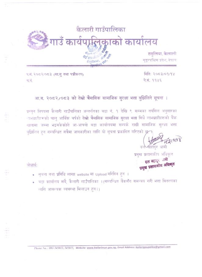 आ.व. २०८२/०८३ को तेस्रो त्रैमासिक सामाजिक सुरक्षा भत्ता बुझिलिने सूचना ।