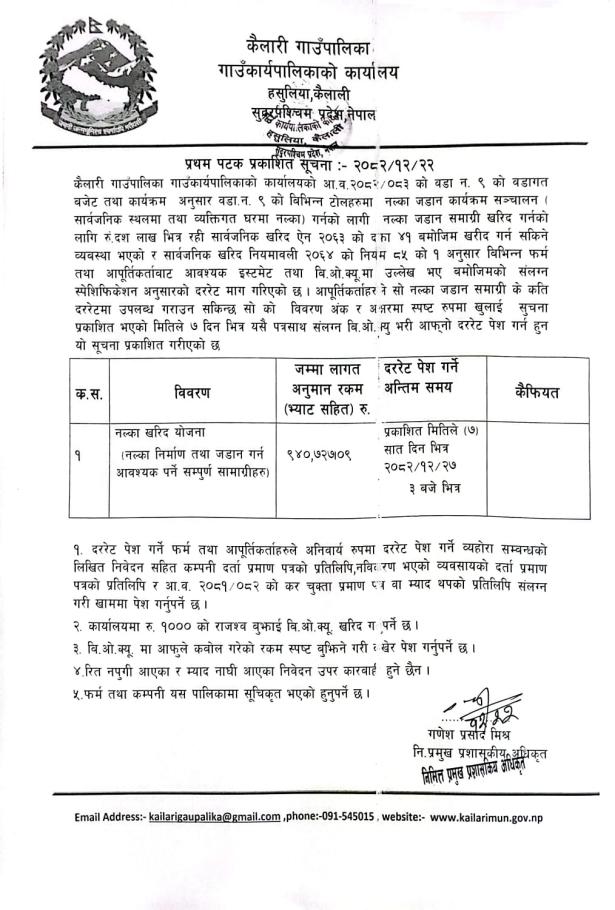 » नल्का खरिद योजना प्रथम पटक प्रकाशित सूचना । मिति २०८२/१२/२२