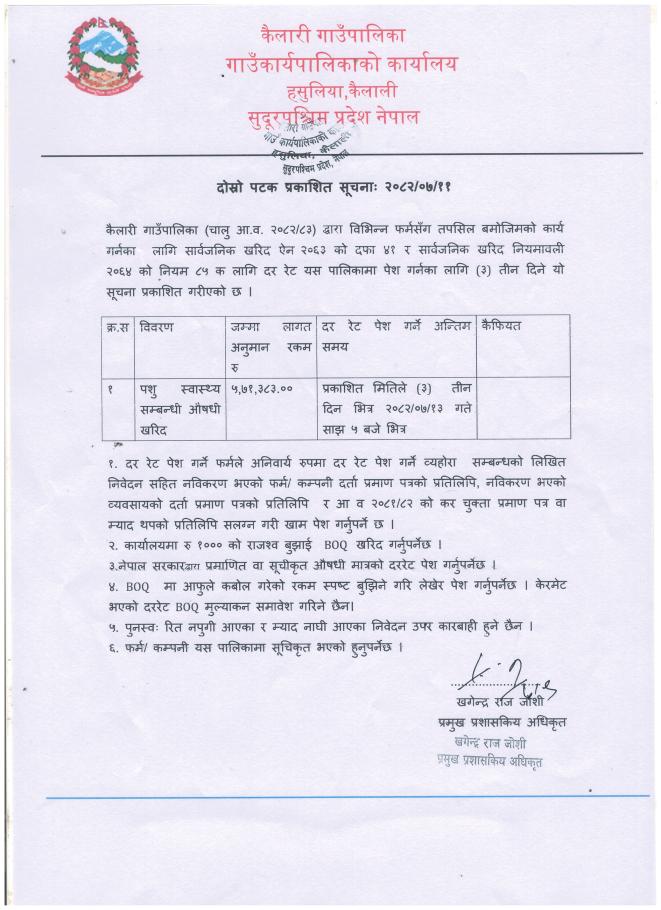 पशु स्वास्थ्य सम्बन्धी औषधी खरिद दोस्रो पटक प्रकाशित सूचना ।