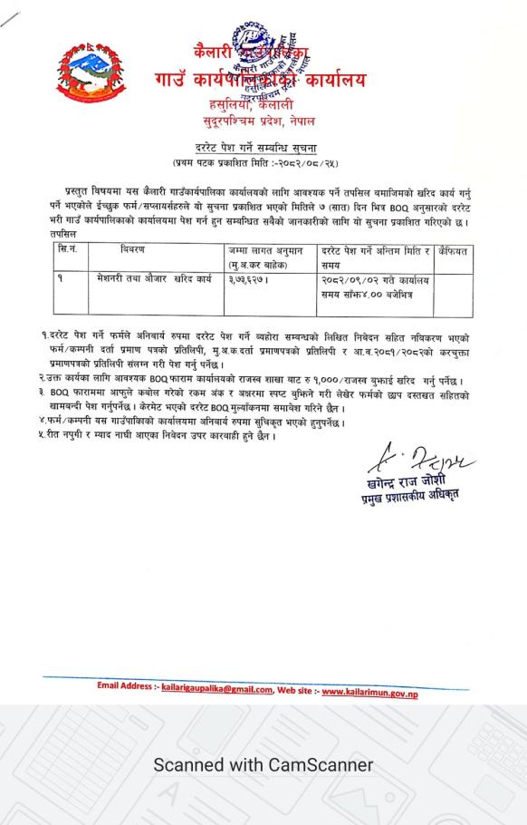मेशनरी तथा औजार खरिद कार्य दररेट पेश गर्ने सम्बन्धी सूचना ।