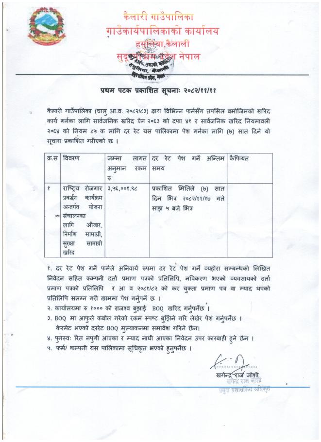 ह्युम पाईप खरिद वडा नं. ७ कैलारी गाउँपालिका सम्बन्धी प्रथम पटक प्रकाशित सूचना ।