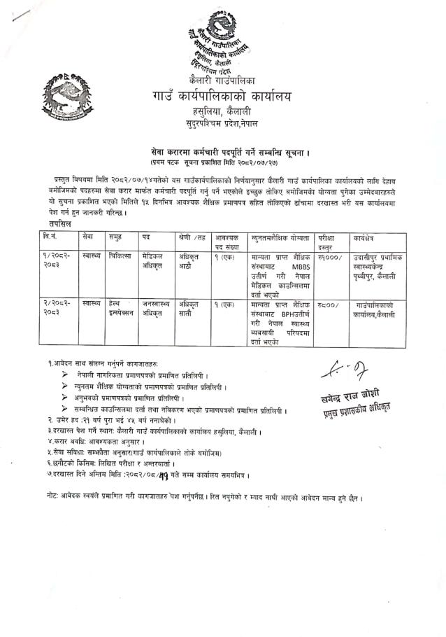 करार सेवामा पदपूर्ति गर्ने सम्बन्धी सूचना । मेडिकल अधिकृत