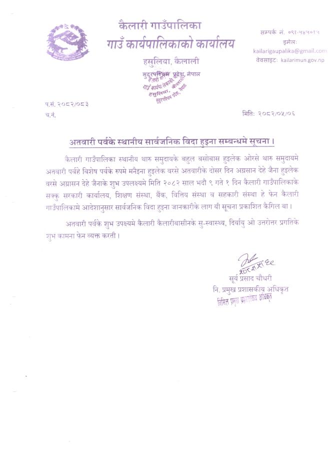 » अतवारी पर्वके स्थानीय सार्वजनिक विदाके सूचना ।
