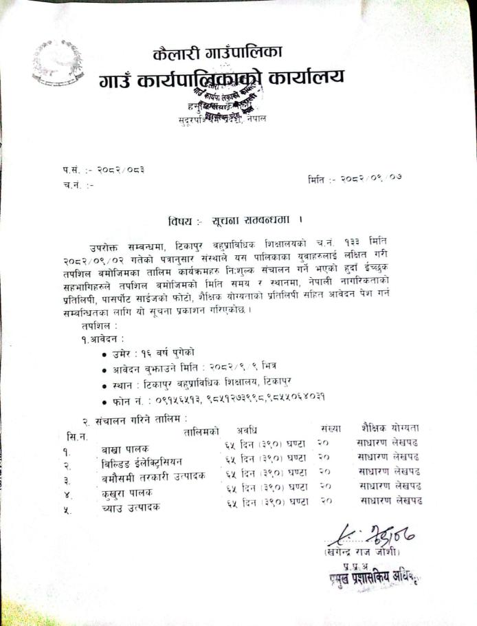 सामुदायिक बनलाई आयमुखी बनाउन सामुदायिक बनभित्र बहुउपयोगी बनस्पति बेतबास वावियो तथा फलफूल खेती विस्तार तथा प्रवर्द्धन कार्यक्रममा छनौट भएका कृषकहरुले सम्झौता गर्न आउने बारे सूचना ।