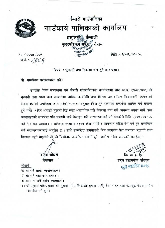 भुक्तानी तथा निकासा बन्द हुने सम्ब्नधमा सूचना ।
