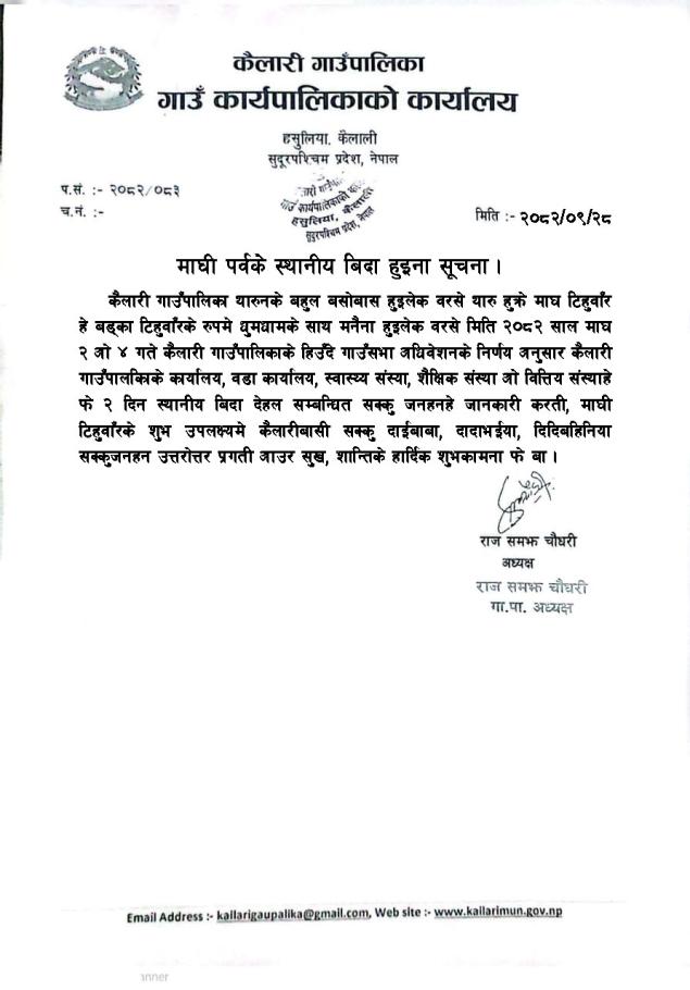 अइटवारी पर्वको स्थानीय बिदा सम्बन्धी सूचना ।