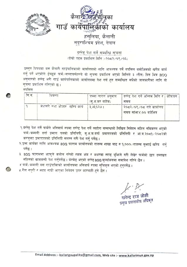 ह्युम पाईप खरिद वडा नं. ७ कैलारी गाउँपालिका सम्बन्धी प्रथम पटक प्रकाशित सूचना ।